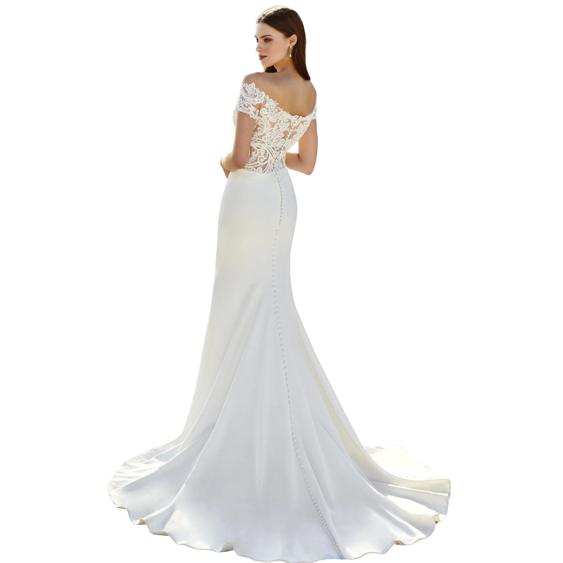 - Back: Illusion lace with covered buttons