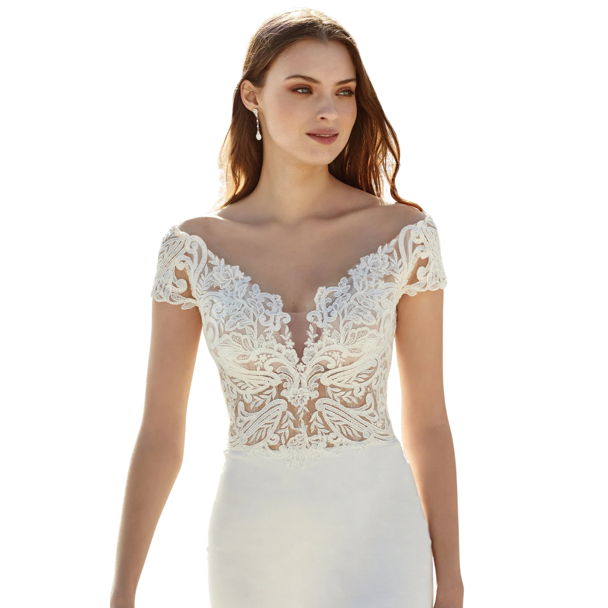 - Bodice: Illusion lace with subtle plunge