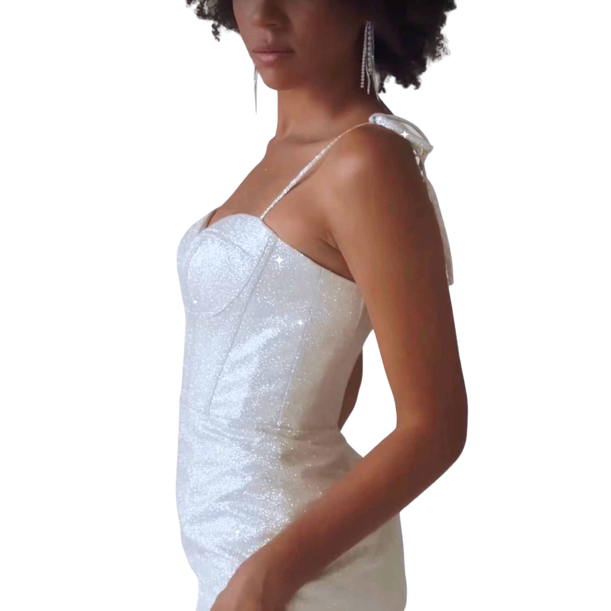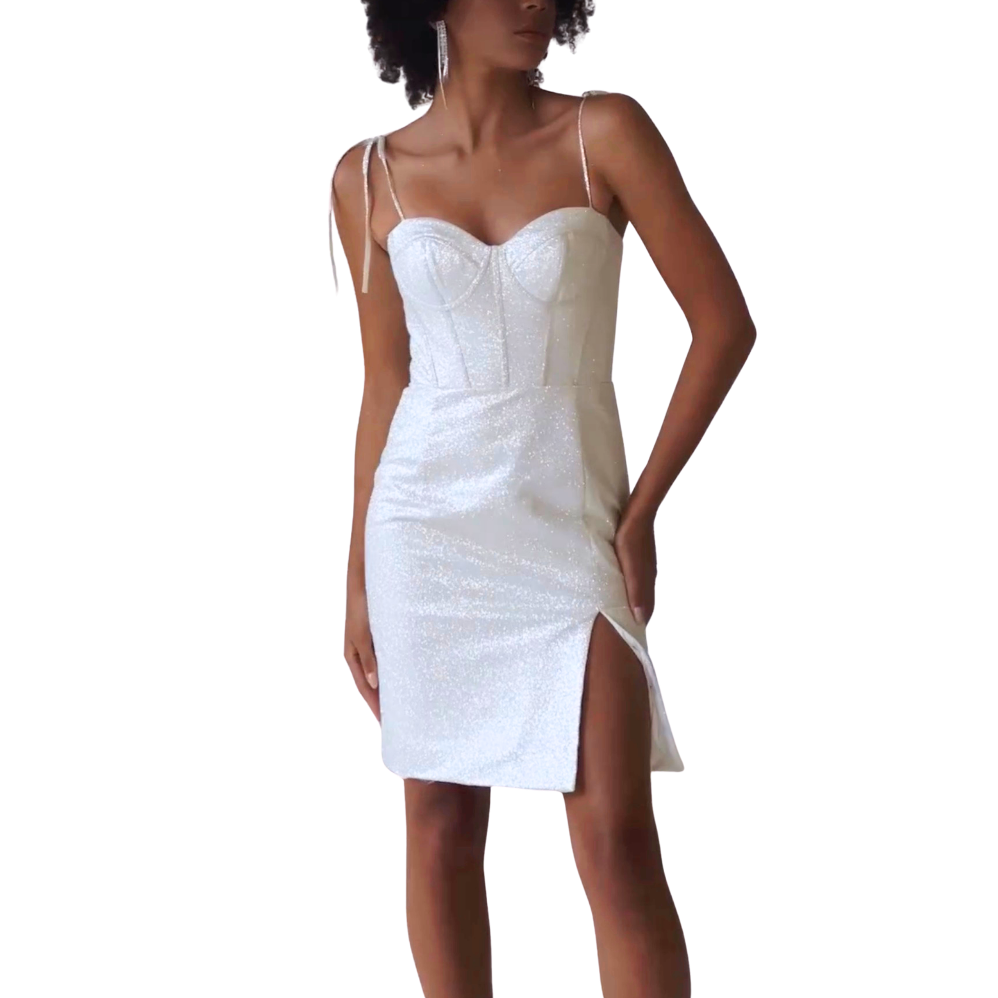 Designed with a softly structured corset bodice and delicate tie straps, Hazel sculpts and supports while shimmering with subtle all-over sparkle. The fitted mini skirt and thigh-high slit add just the right amount of drama, making her a standout choice for rehearsal dinners, welcome parties, bachelorette nights, or any moment that calls for bridal glow with attitude.