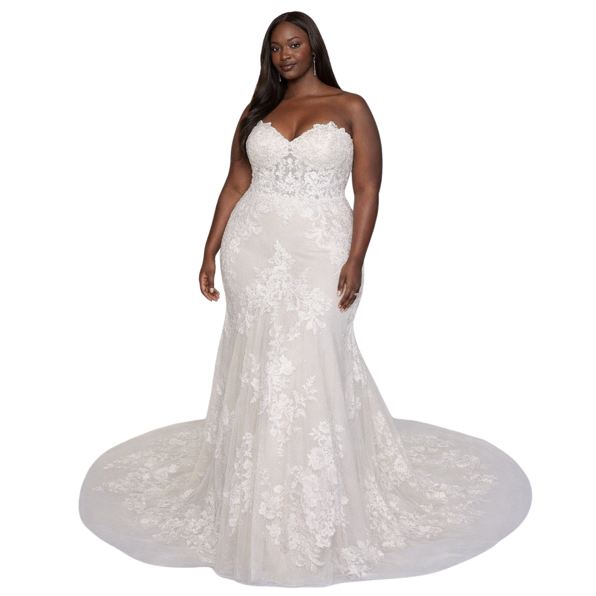 Romantic lace meets sculpted fit. This illusion bodice features appliquéd floral lace, a soft sweetheart neckline, and a figure-flattering fit & flare silhouette. Finished with a chapel train for the perfect balance of elegance and drama.