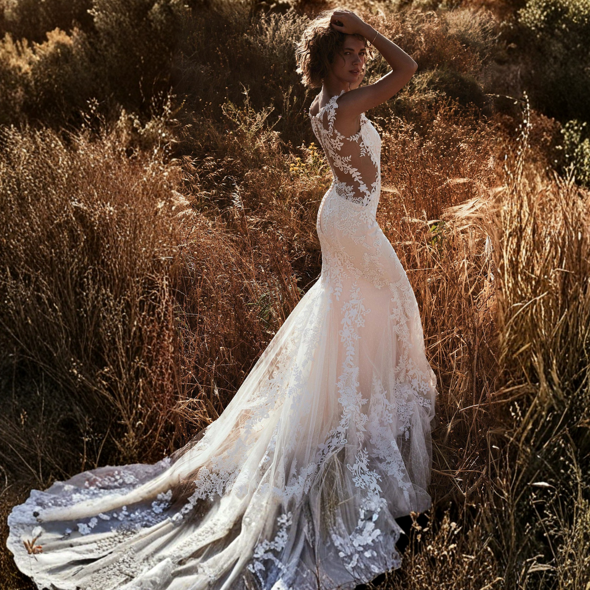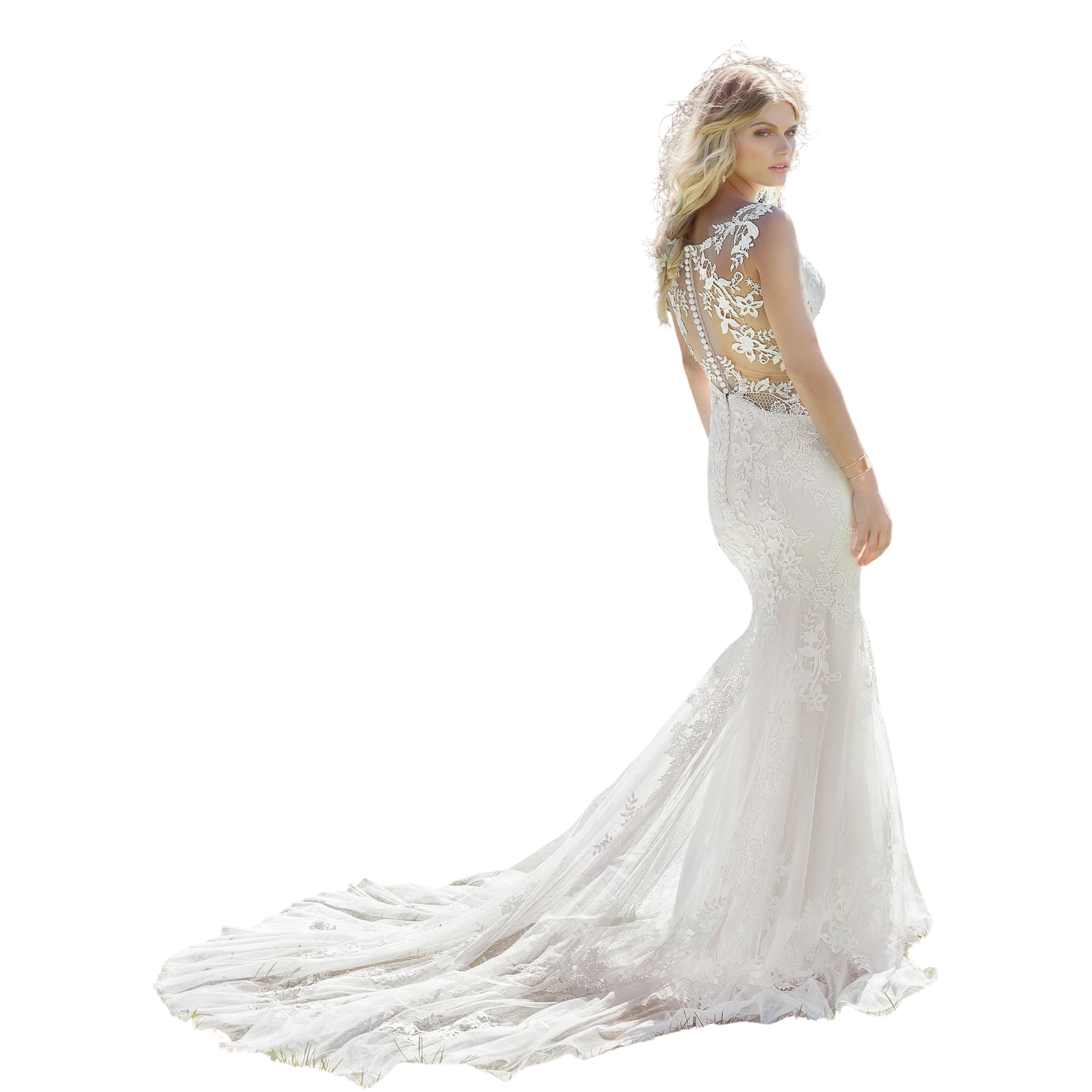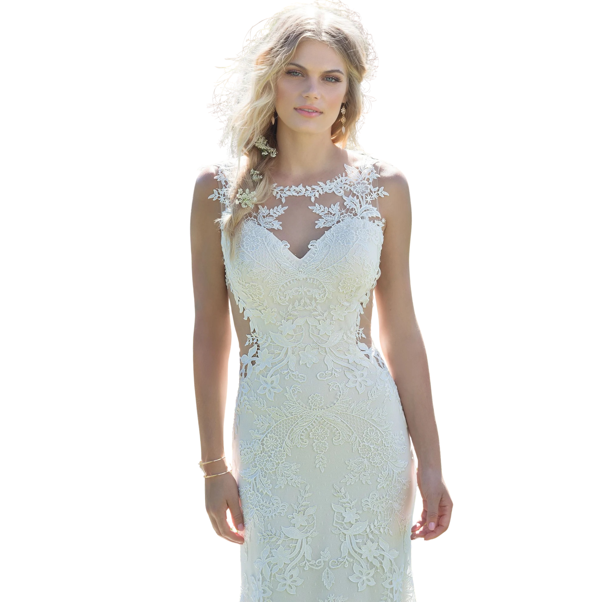 A fitted lace look with a touch of edge. This fit-and-flare features illusion side cutouts, hand-placed lace, and a jersey-lined skirt for a smooth, comfortable fit. The Sabrina neckline highlights the shoulders beautifully while the chapel train adds soft bridal drama.