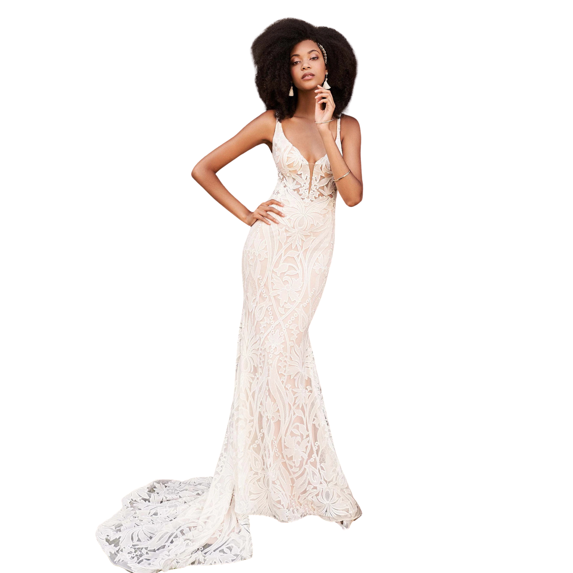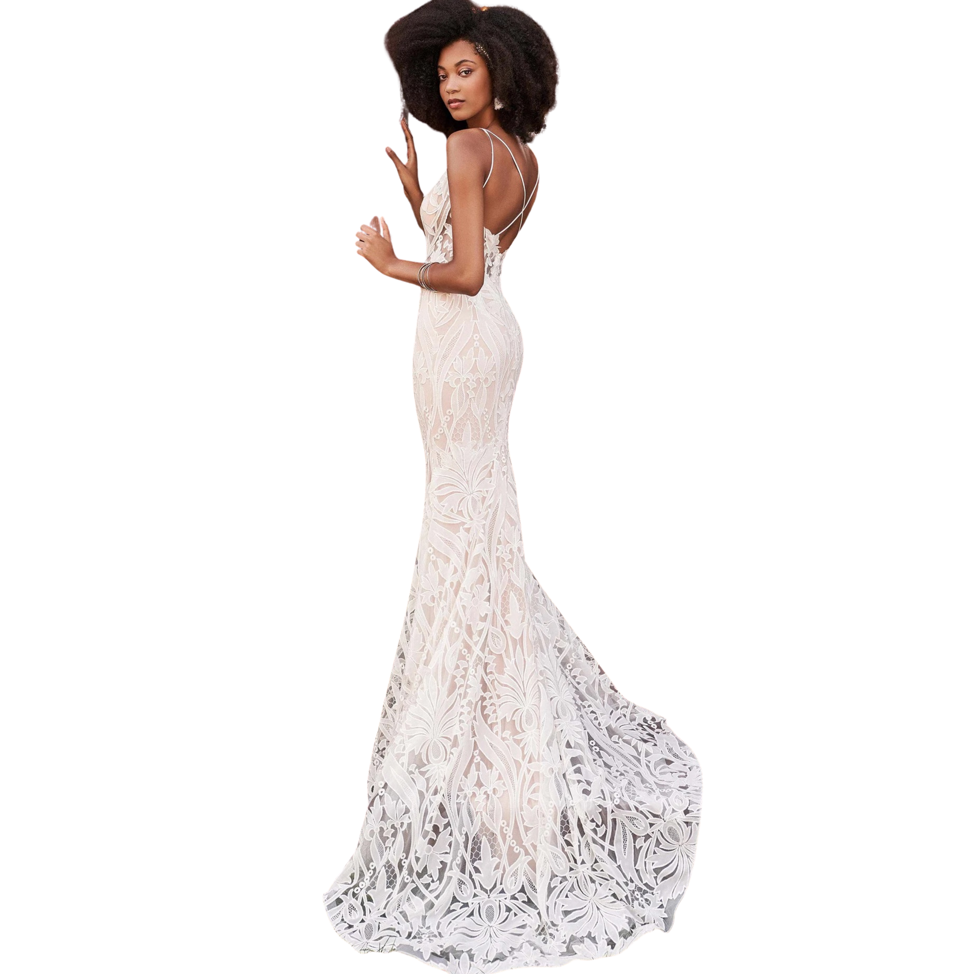 Boho, bold, and lightweight. Embroidered chiffon lace pairs with a sultry plunging neckline, illusion bodice, and strappy crisscross back. Finished with soft jersey lining for all-day comfort and a romantic chapel train.